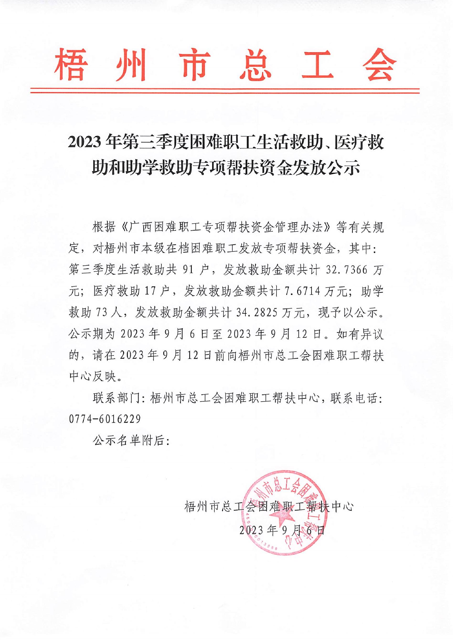 2023年第三季度困難職工生活救助、醫(yī)療救助和助學救助專項幫扶資金發(fā)放公示